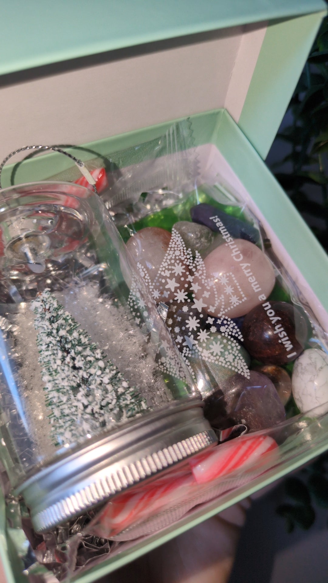 Beautiful Christmas Eve box, with a stunning tree decoration with a good bag full of crystals and some Christmas sweeties 🎁🎄